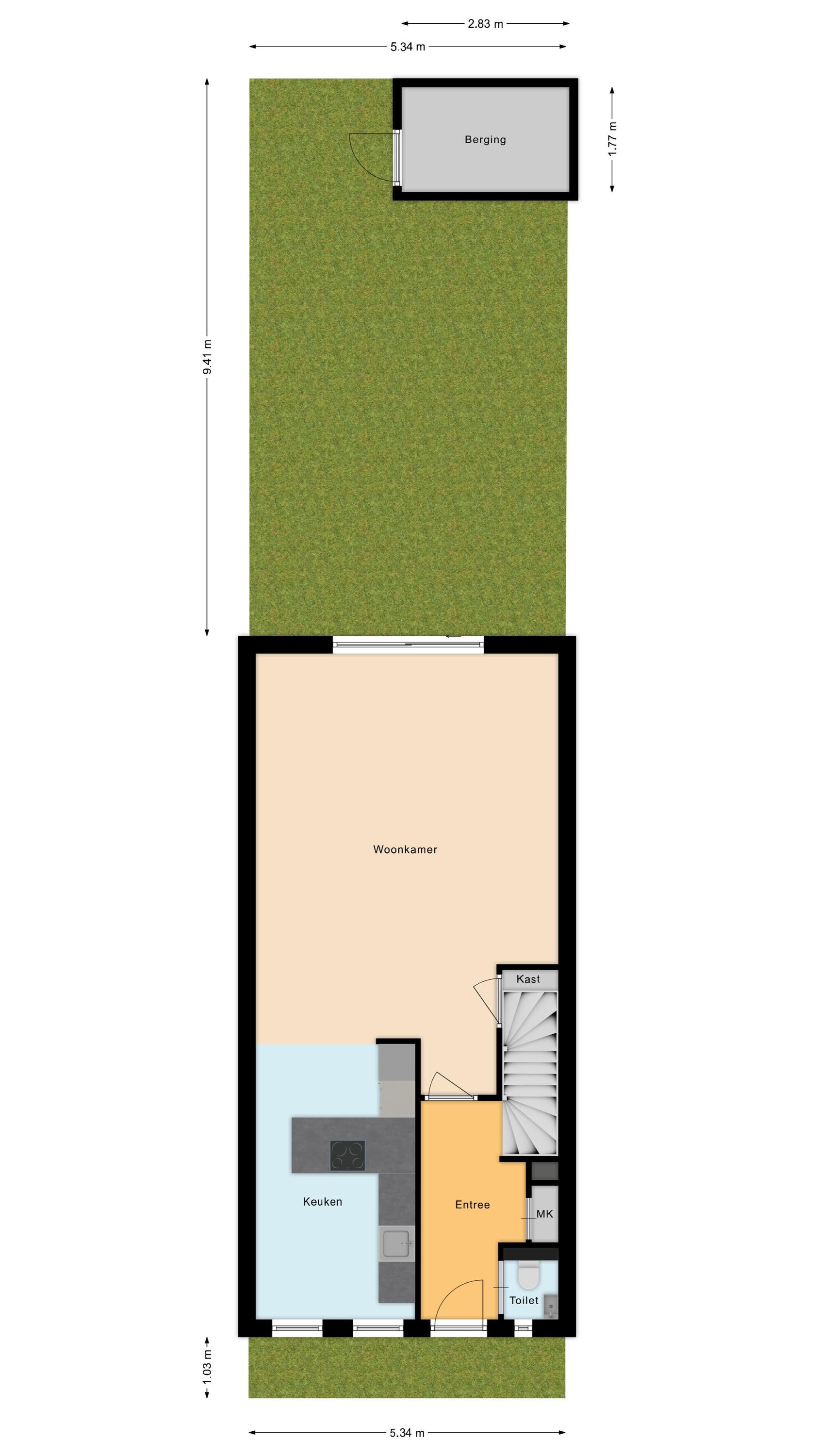 Begane Grond: Bij binnenkomst betreedt u de hal, die toegang biedt tot de toiletruimte, de meterkast, de trapopgang en de ruime woonkamer.