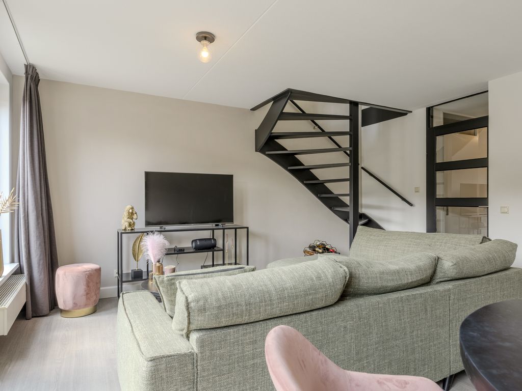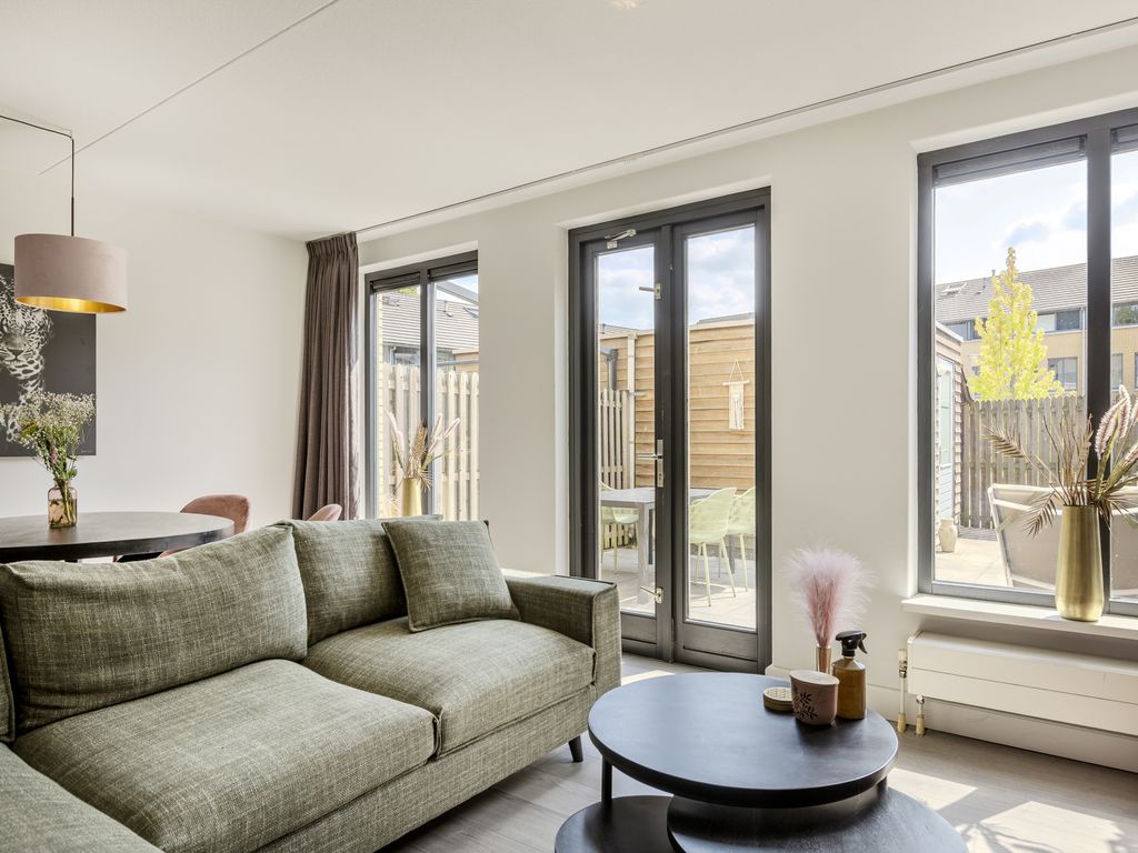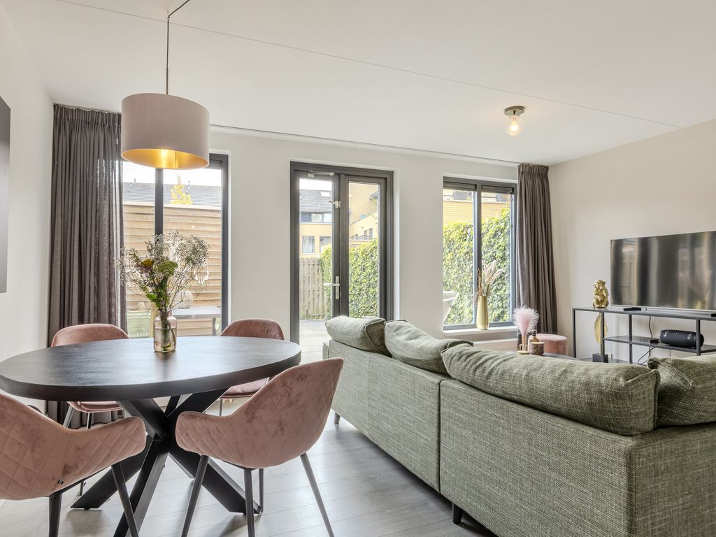 Lichte woonkamer met raampartijen over de gehele breedte aan de achterzijde en twee openslaande tuindeuren naar de achtertuin. Open trap naar de verdieping.
