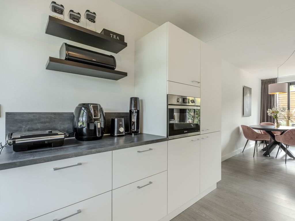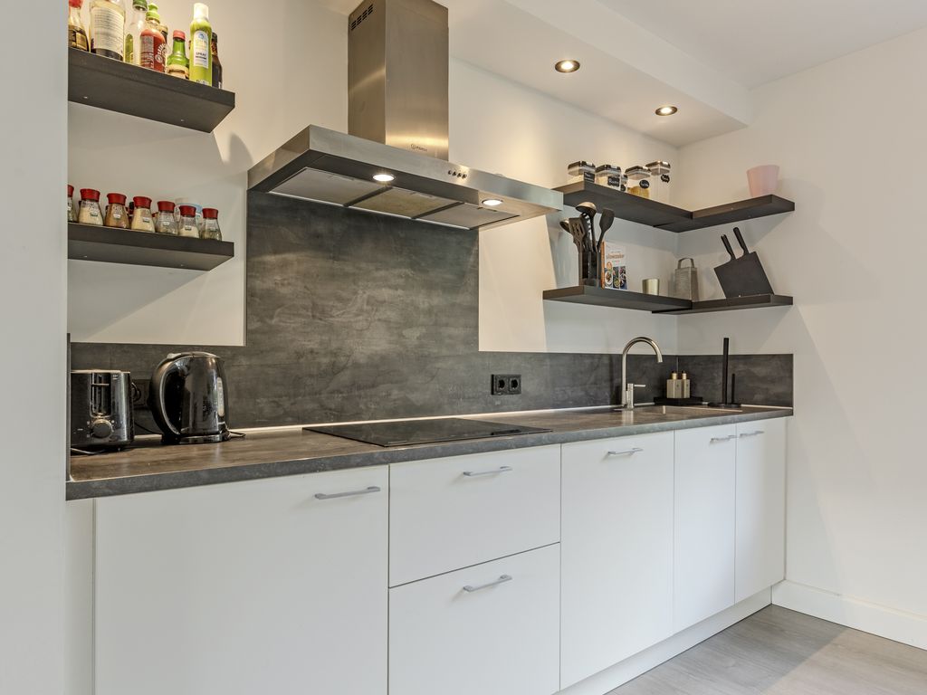 Moderne, licht uitgevoerde inbouwkeuken (2021), in tegenover elkaar geplaatste opstelling, uitgerust met een inductiekookplaat, afzuigkap, vaatwasser, combimagnetron en koel-/vriescombinatie. De gehele begane grond is voorzien van een laminaatvloer.