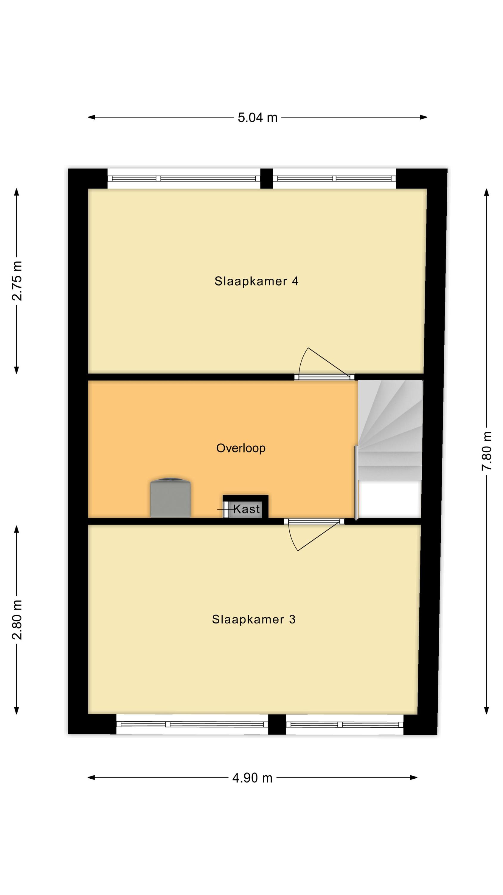 Overloop met trapopgang naar de tweede verdieping en toegang tot twee royale slaapkamers aan de voor- en achterzijde.
