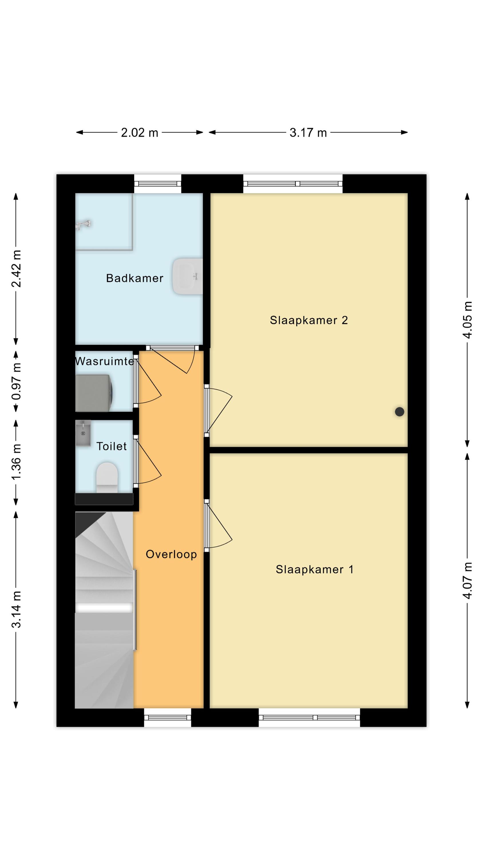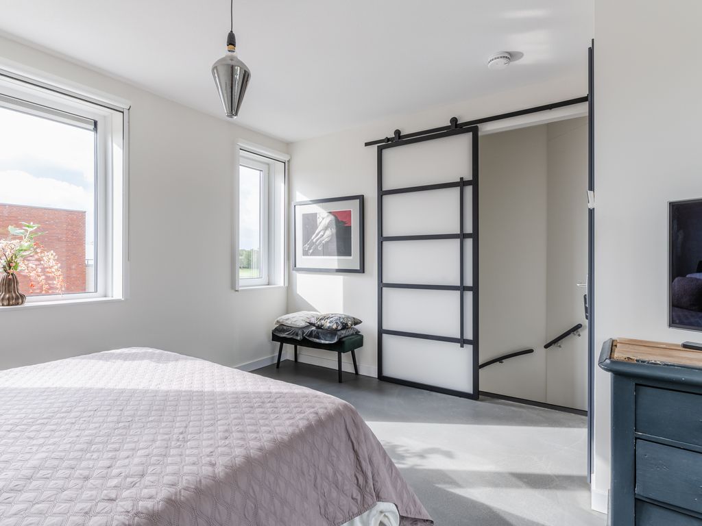 Overloop met daglichttoetreding, vaste kast met opstelplaats voor wasapparatuur en separate toiletruimte met wandcloset en fonteintje. De moderne badkamer beschikt over een inloopdouche, wastafelmeubel, designradiator en een raam voor natuurlijke ventilatie. Op deze verdieping bevinden zich twee ruime slaapkamers, beide met vloerverwarming en strakke wand- en vloerafwerking.