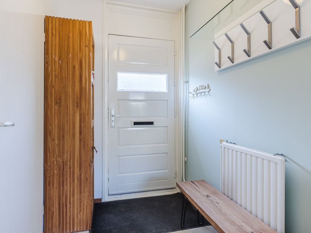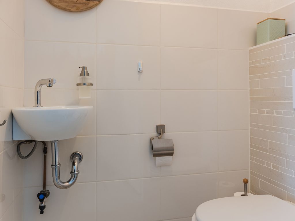 Entree met betegelde hal, meterkast (vernieuwd en uitgebreid in 2017), moderne toiletruimte (2019) met wandcloset en fonteintje.
