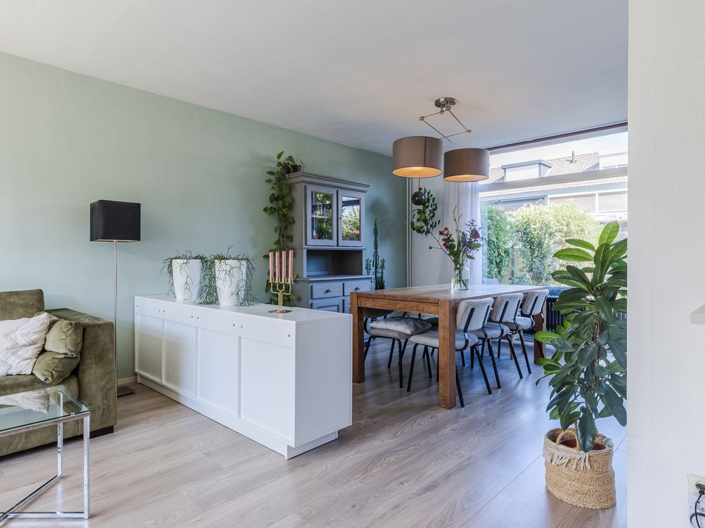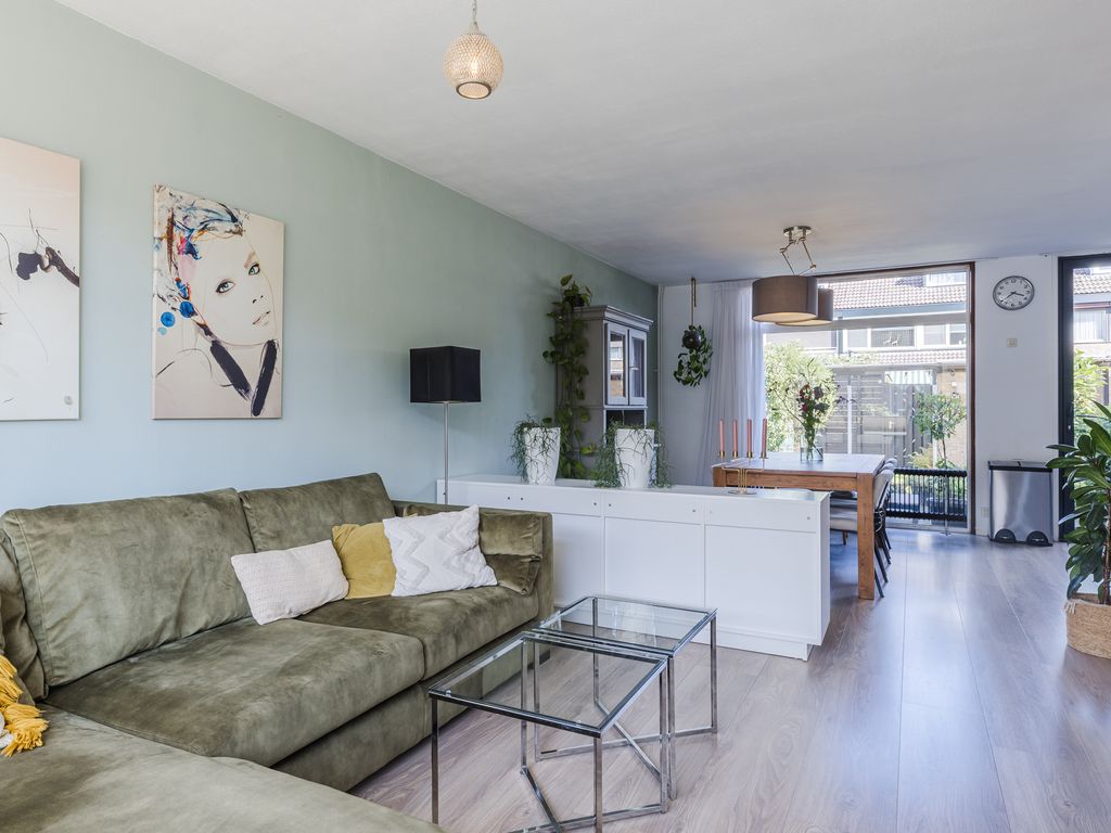 Lichte woonkamer met zitgedeelte aan de voorzijde en open keuken aan de tuinzijde.